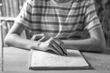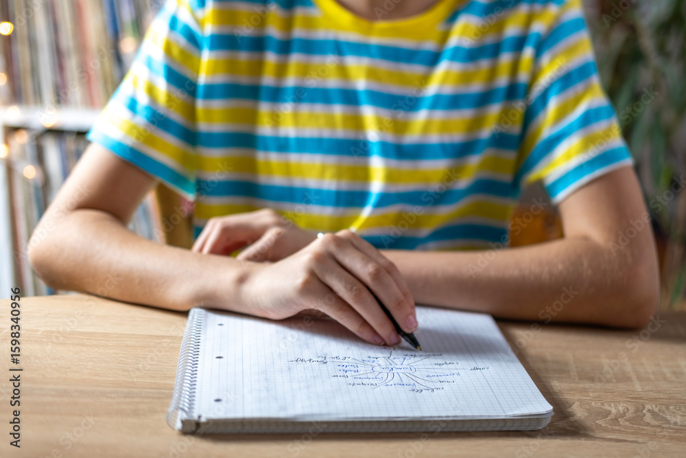 teenage boy writes diligently in notebook, teen sketches ideas on graph paper, draws family mind map, connecting mother, father, and siblings with care, homework, education and concentration