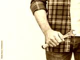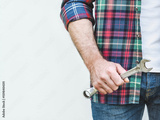 Attractive man in work clothes and wrench. Labor day. Close-up, indoors. Studio shot. Front view, close up, studio shot. Labor and employment concept