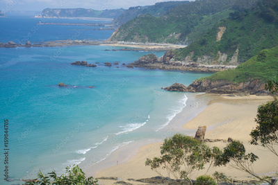 Amazing landscape with ocean, cliffs, beach, greens and flowers in summer day; wallpaper of the Bay of Biscay, Cantabrian Sea