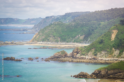 Amazing landscape with ocean, cliffs, beach, greens and flowers in summer day; wallpaper of the Bay of Biscay, Cantabrian Sea