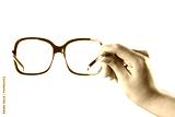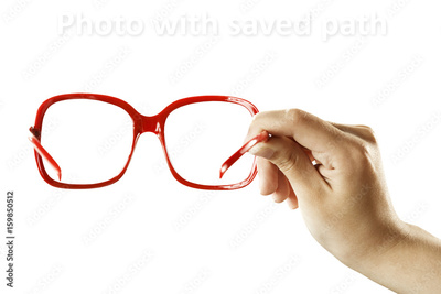 Woman hand holding red glasses with white clear background.