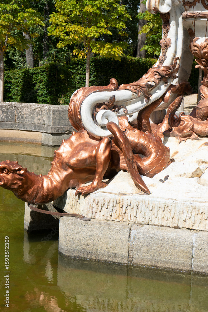 Sculptural dragon fountain in Jardines del Palacio Real de la Granja, España under bright sunlight