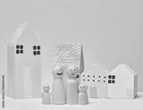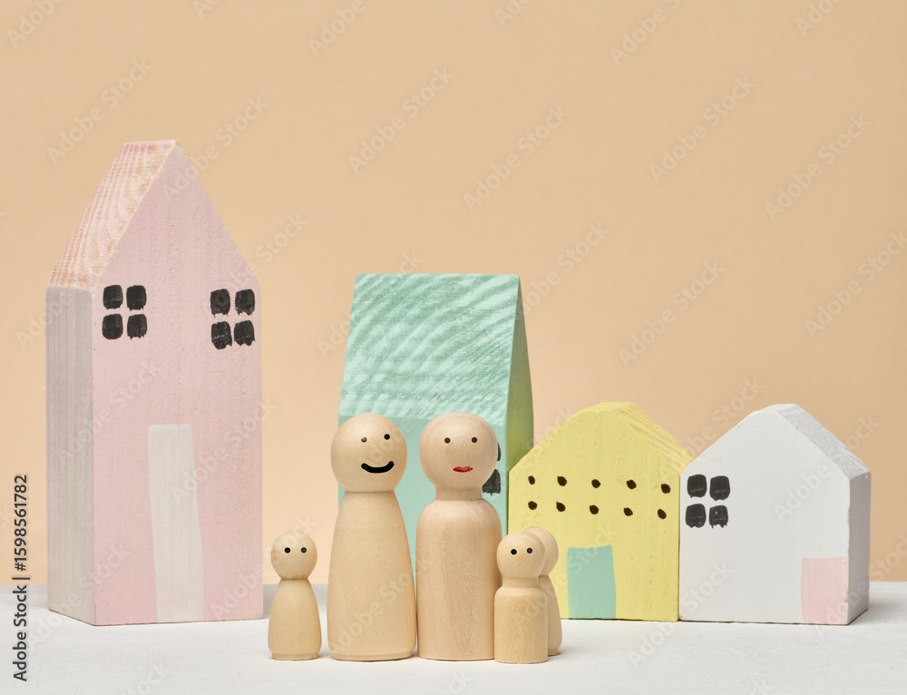 A row of wooden houses in front of them are four wooden figures symbolizing a family.