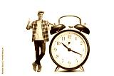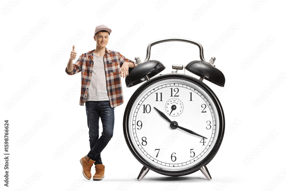 Guy gesturing thumbs up and leaning on a big alarm clock