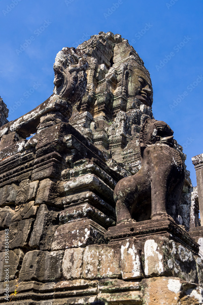 Ruins of famous Bayon Buddhist Temple , Angkor Thom ,Cambodia during sunny day.