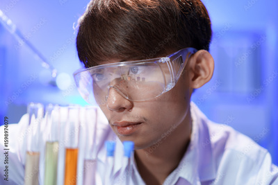 Scientists working in Laboratory using pipette dropping liquid sample into test tube.
