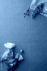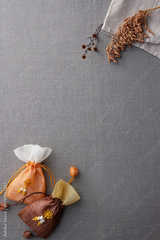 추석을 위한 전통 한국식 보자기 선물 포장지, 도자기 꽃병과 원단, 나뭇가지로 구성된 우아한 한 국식 테이블 배경.