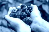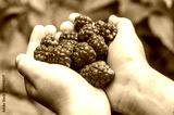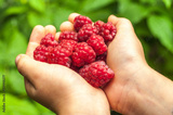 A handful of raspberries in the hands of a child