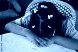 Child resting with head down on a table in a cafe