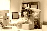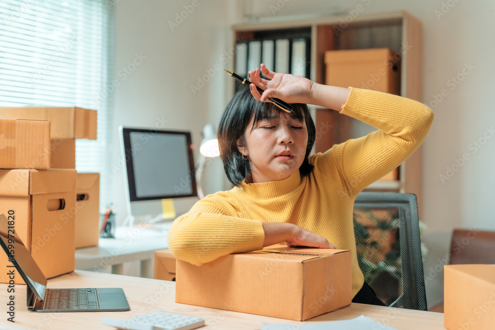 Young asian woman entrepreneur feeling tired and stressed while packing and shipping online orders in her home office, surrounded by cardboard boxes and using a computer