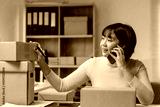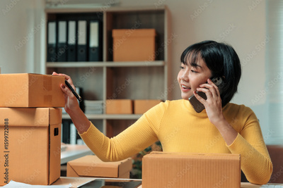 Young Asian woman entrepreneur talking on mobile phone and writing address on cardboard box while working in her warehouse or home office, managing her online business