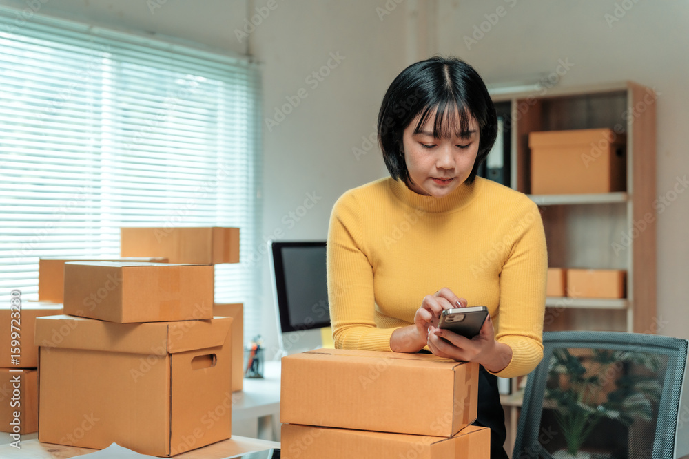 Young Asian woman entrepreneur using smartphone checking and managing online orders in warehouse, preparing parcel boxes for delivery to customers, working in her office