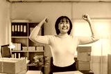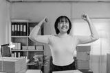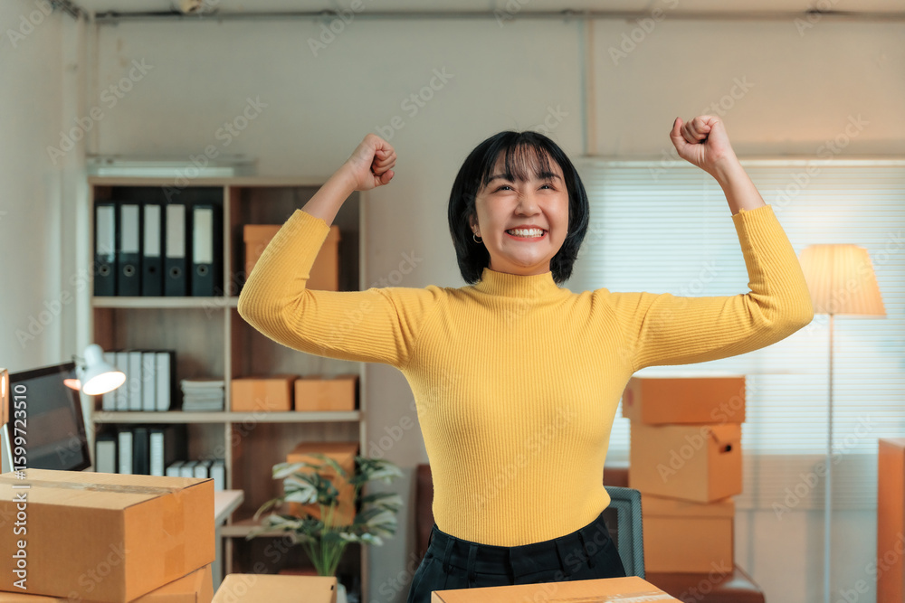 Young Asian woman raising her arms in celebration, smiling joyfully while surrounded by cardboard boxes in her startup office, embodying the excitement of entrepreneurial success