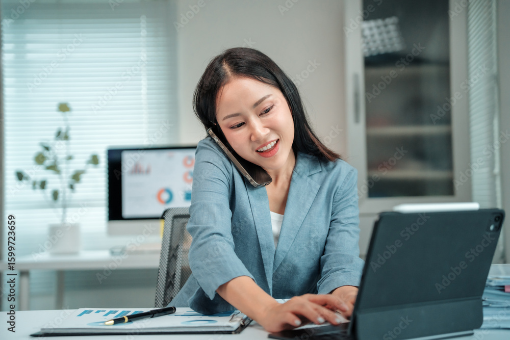 Young Asian businesswoman talking on phone and working on digital tablet while sitting at desk in modern office, smiling and looking at screen, with documents and computer in background