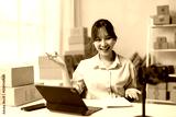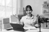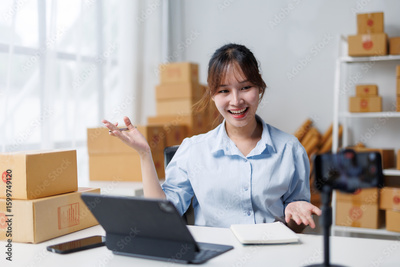 Happy young asian entrepreneur gesturing while recording a video for her online store using her smartphone and surrounded by cardboard boxes