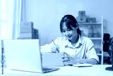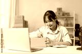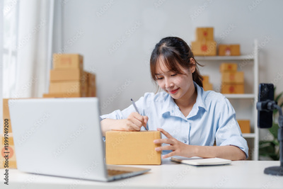 Young Asian woman entrepreneur is writing on a shipping label while using a laptop and smartphone to manage her online orders, surrounded by cardboard boxes in her home office