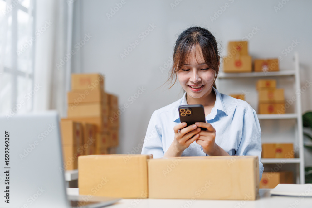 Smiling asian female entrepreneur managing her small business from home, checking orders on her smartphone and preparing packages for shipment
