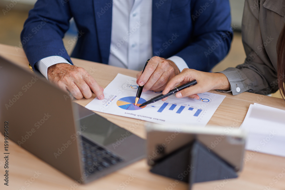 Group of confident business people point to graphs and charts to analyze market data, balance sheet, account, net profit to plan new sales strategies to increase production capacity.