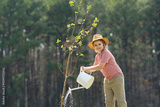Child in hat cultivating tree with shovel. Child cultivating tree on backyard. Child cultivating tree in spring field. Little gardener with watering can and shovel. Child cultivating tree in garden.
