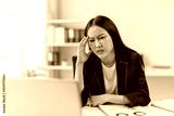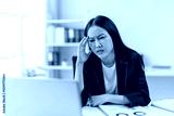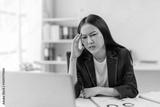 Young professional woman feeling tired and suffering from headache after working on computer laptop for a long time in bright modern office