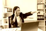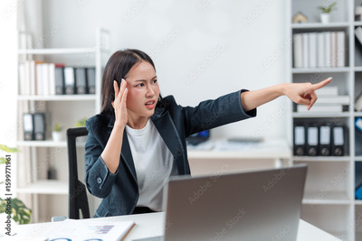 Young Asian manager sitting at her desk in the office, experiencing a severe headache while pointing decisively to fire an employee, showcasing frustration and tension in the workplace