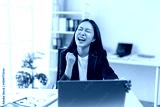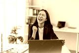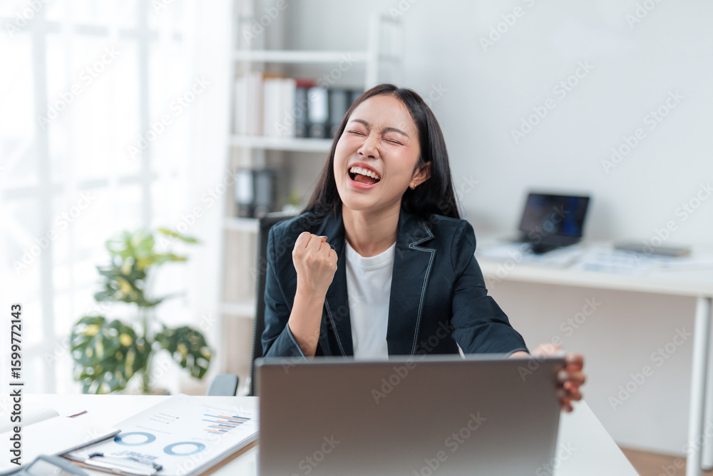 Young successful asian businesswoman celebrating with arms up and screaming while sitting at desk and working with laptop, celebrating business success in modern office