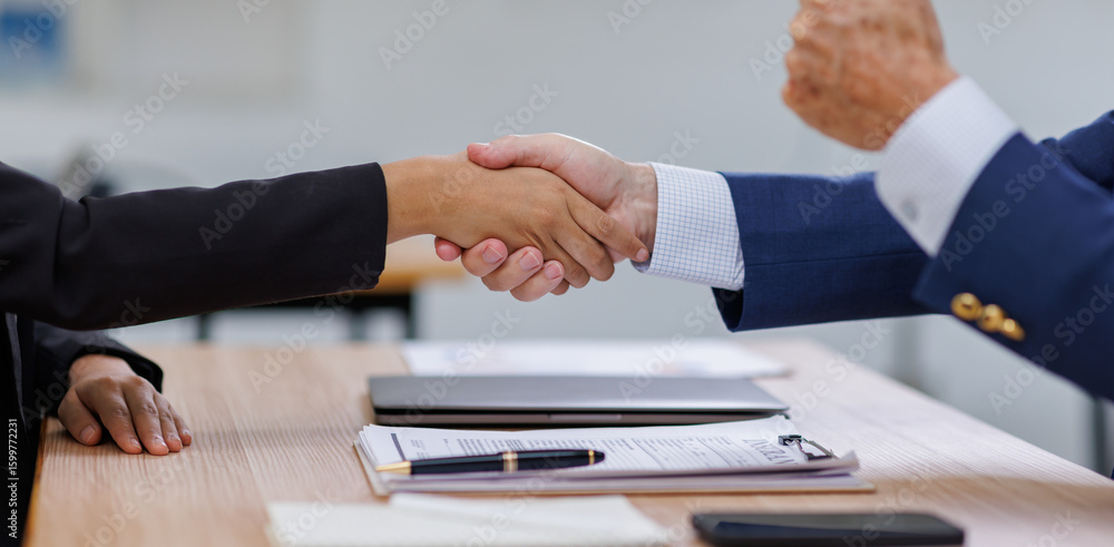 Happy Two business handshake to congratulate success. Successful Asian business people working together team.