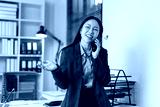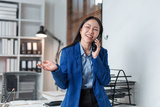 Asian businesswoman in a blue suit is standing in her office, talking on the phone and gesturing with her hand, smiling and looking happy while discussing business matters