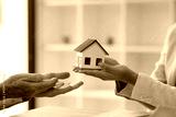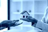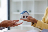 Estate business agent giving house Real estate transaction with agent giving house keys to client over a contract, calculator on table.