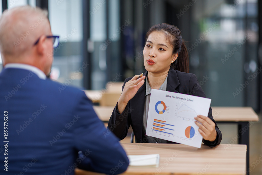 Businesswoman financial expert analyzes business report graph and chart at the office. Concept of financial economy and marketing research.
