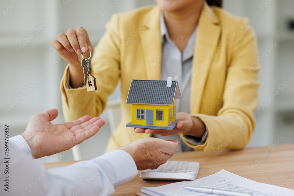Estate business agent giving house keys to client after signing agreement contract real estate with approved mortgage application form, concerning mortgage loan offer for and house insurance.