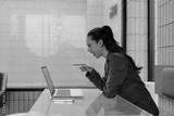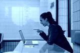 Asian businesswoman is pointing at her laptop and laughing while making a video call in a modern office environment, enjoying a moment of amusement during her workday