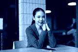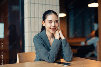 Young Asian businesswoman smiling and posing with her hands together in a modern office space, with a smartphone on the table in front of her, enjoying her working time