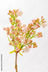 Soft pink flower buds and blooms appear on slender branches, embodying spring's arrival and beauty