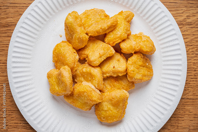 A delectable arrangement of crispy chicken nuggets laid on a white paper plate, ready to enjoy
