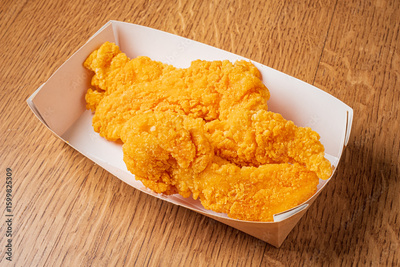 Deliciously fried chicken tenders are arranged neatly in a takeout container, ready to enjoy