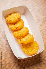 Five crispy potato rounds sit neatly in a tray, ready to be enjoyed for a tasty meal