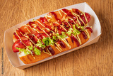 Savoring a gourmet hot dog with vibrant toppings looks enticing on a rustic surface