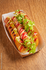 Two gourmet hot dogs on a stylish tray, topped with crisp lettuce and vibrant sauces