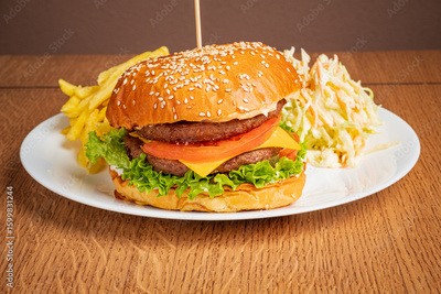Enjoy a juicy burger, fresh lettuce, and crispy fries on a sunny day!