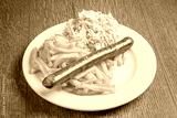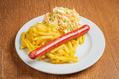 Savory hot dog rests on a pile of golden fries, accompanied by vibrant coleslaw at a sunny diner
