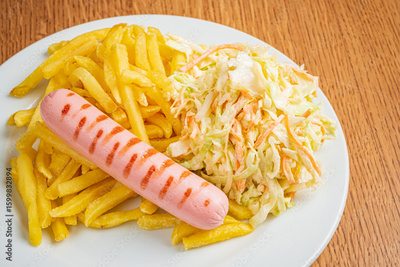A hearty plate features golden fries, a juicy grilled sausage, and a refreshing side of coleslaw