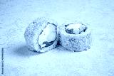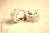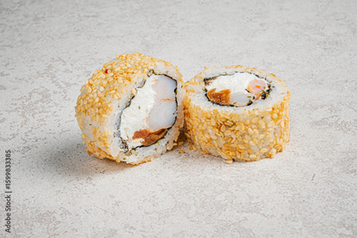 Sushi rolls bursting with flavors, featuring shrimp and smooth filling on a minimalist backdrop