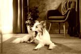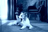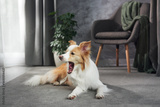 Dog lays on floor mid-yawn in cozy living room with neutral tones and a potted plant.