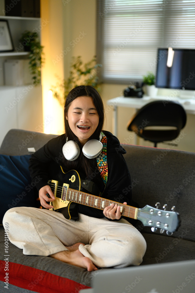 Smiling teenage girl playing electric guitar at home, enjoying a virtual music lesson through laptop