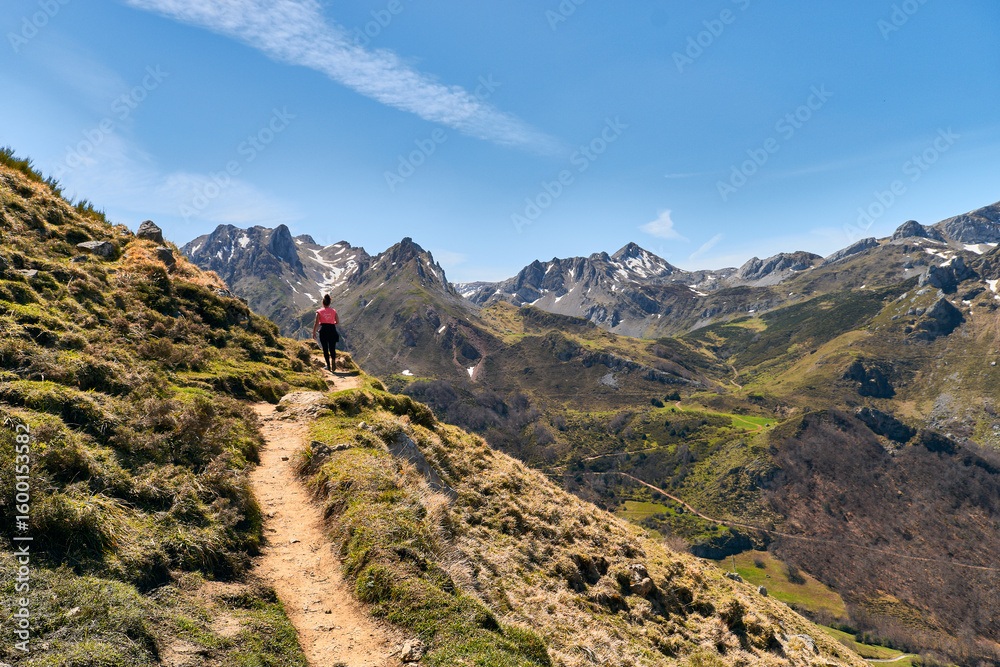 Hiker on Mountain Trail with Scenic Peak Views