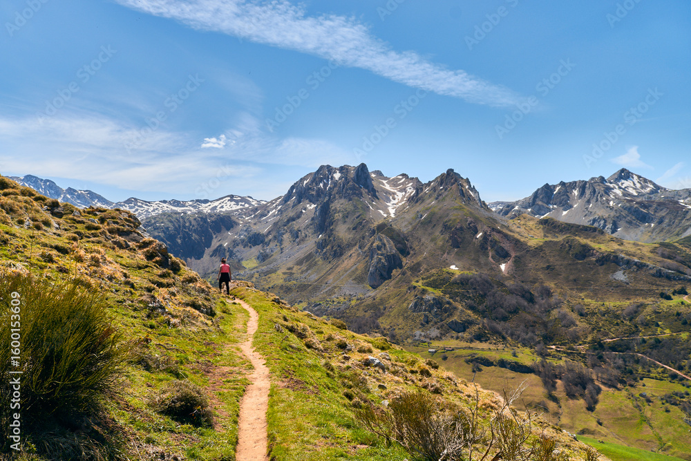 Hiker on Mountain Path with Snow-Capped Peaks