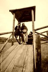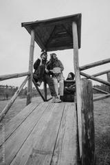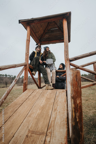 Friends dressed for cool weather spend time together on a rustic wooden platform surrounded by a rural landscape, evoking feelings of camaraderie, friendship, connection, and outdoor exploration.