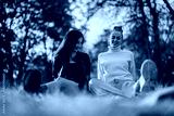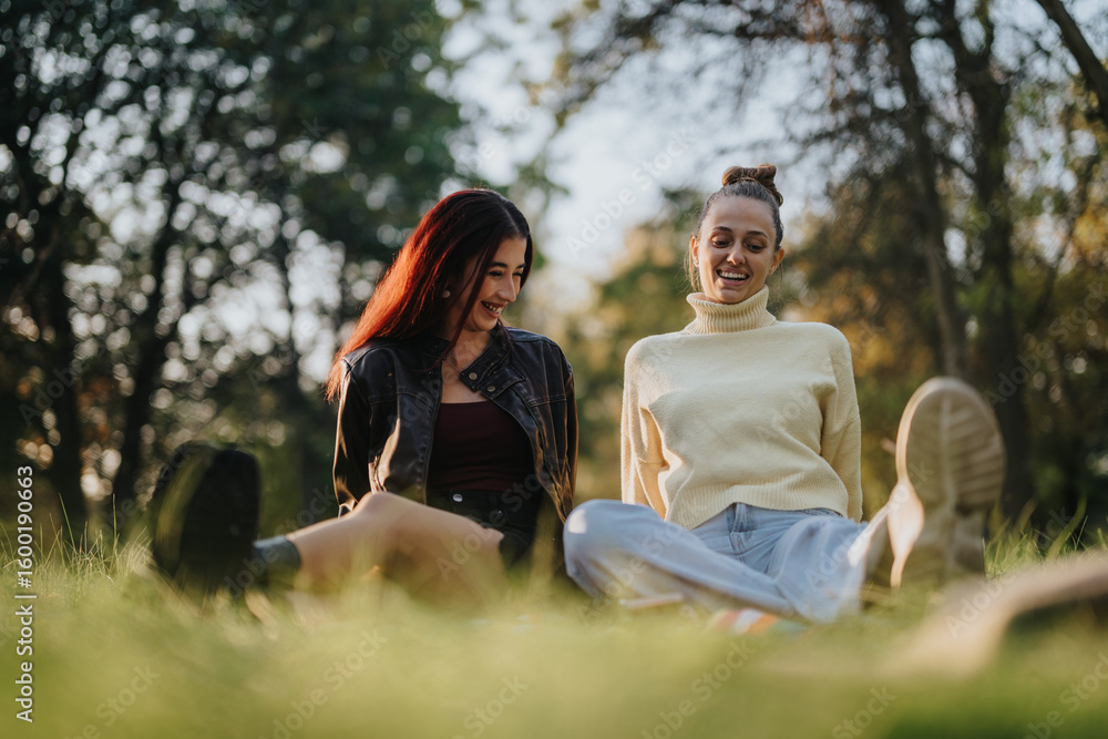 Two young women sit on grass, enjoying each other's company in a park. Their laughter and smiles reflect joy and friendship amid the warm, natural colors of a sunny autumn afternoon.