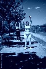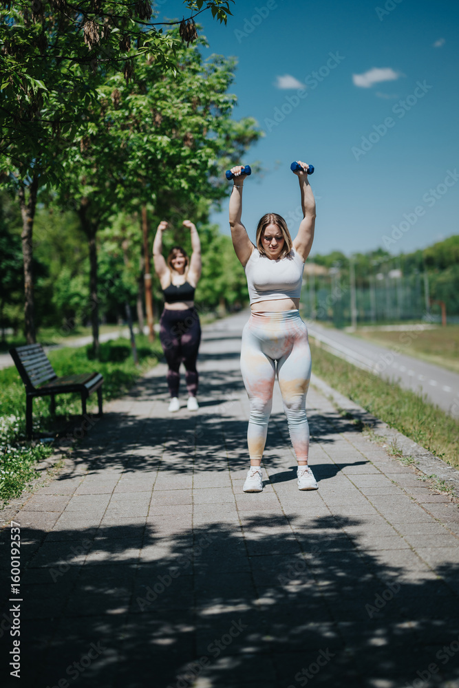 Two women are actively participating in outdoor fitness by working out with dumbbells, enjoying the sunny weather and lush greenery in the park.